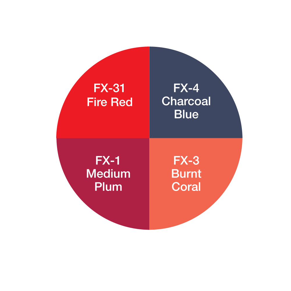 The Burns and Blisters Wheel contains four of our essential shades for creating fake burn simulations. Shades Burnt Coral, Fire Red, and Medium Plum let artists create various tones of burnt flesh, while Charcoal Blue provides the perfect option for creating charring effects.