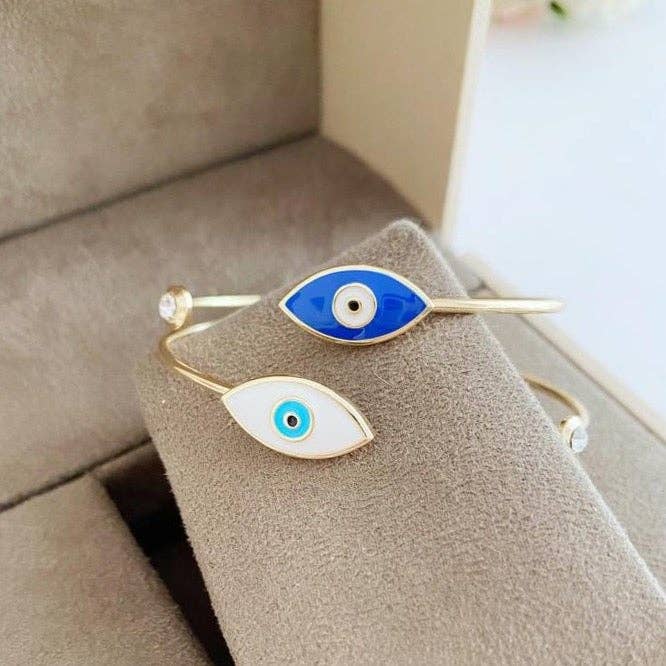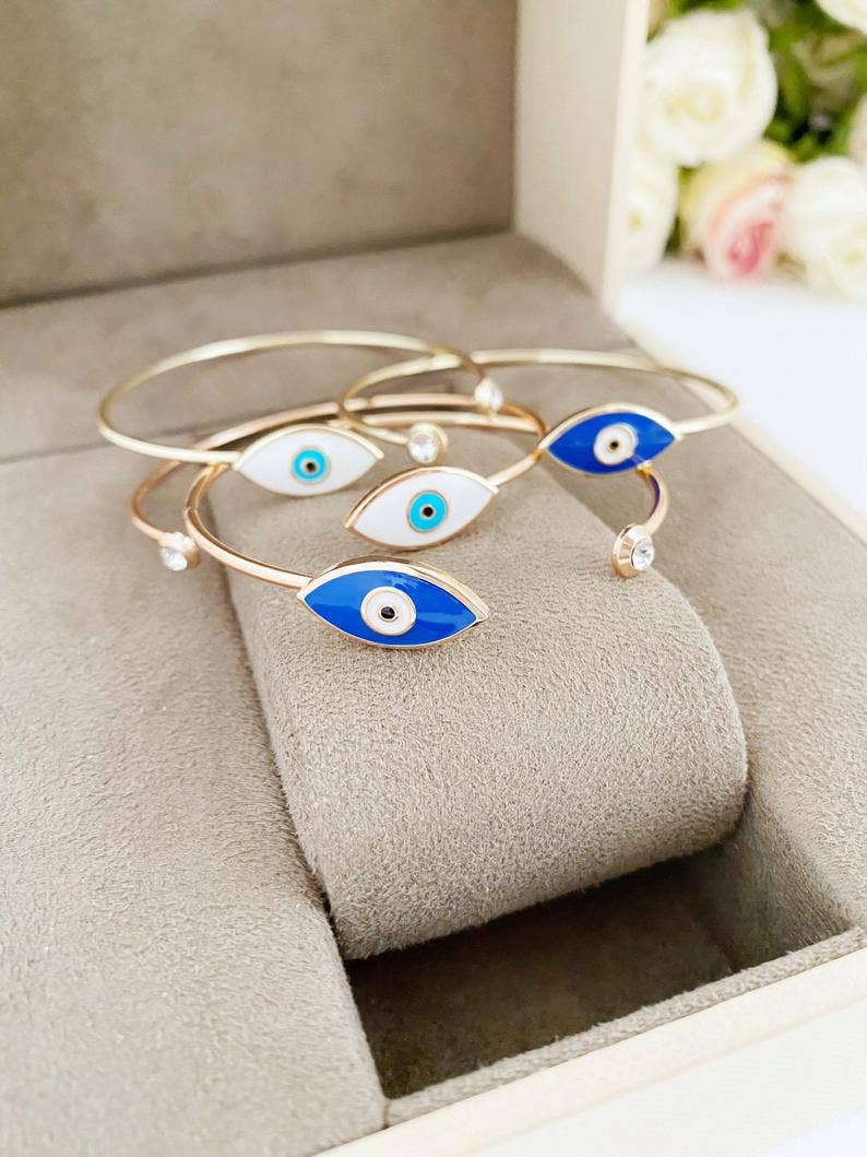 Evil Eye Cuff Bracelet. Rose Gold Bangles w Blue White Evil Eye. Turkish Evil Eye It is a bangle bracelet combining the tiny evil eye charm with bangle part. The main oval evil eye charm part is MOVABLE so it is easy to wear!