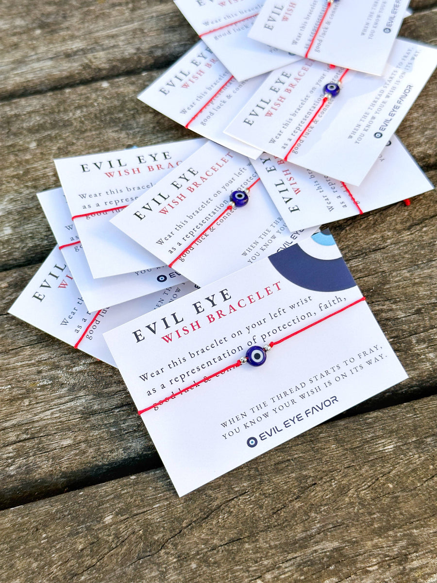 Handmade evil eye red cord wish bracelet. Wear this bracelet on your left wrist as a representation of protection, faith, good luck and connection. - wax cotton cord - these bracelets will fray and fall off - bracelets come with a wish card.