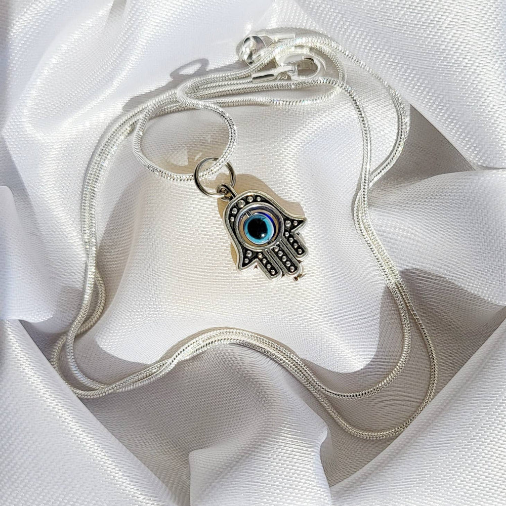 Embrace blessings and protection with our Hand of Hamsa Necklace. Handcrafted for good fortune, this symbol, known as the 'hand of god,' shields against misfortune and invites happiness, luck, health, and abundance. The simple design makes it perfect for everyday wear. Each necklace includes an 18-inch 925-silver snake chain, providing a timeless and elegant look. Wear it daily and cleanse often to purify the absorbed energy, as each piece is thoughtfully cleansed with white sage before shipping.