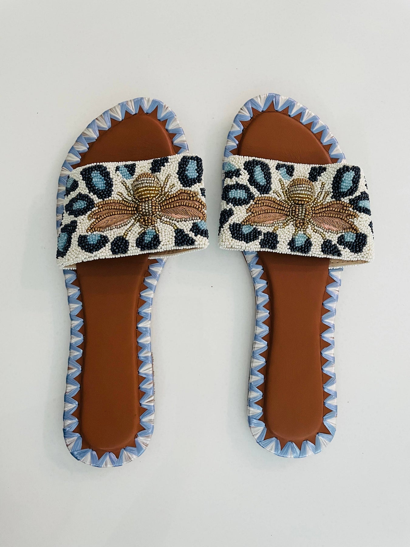 Queen Bee Beaded Slides. Blue Leopard Glam Handcrafted Leopard Accent Sandals
