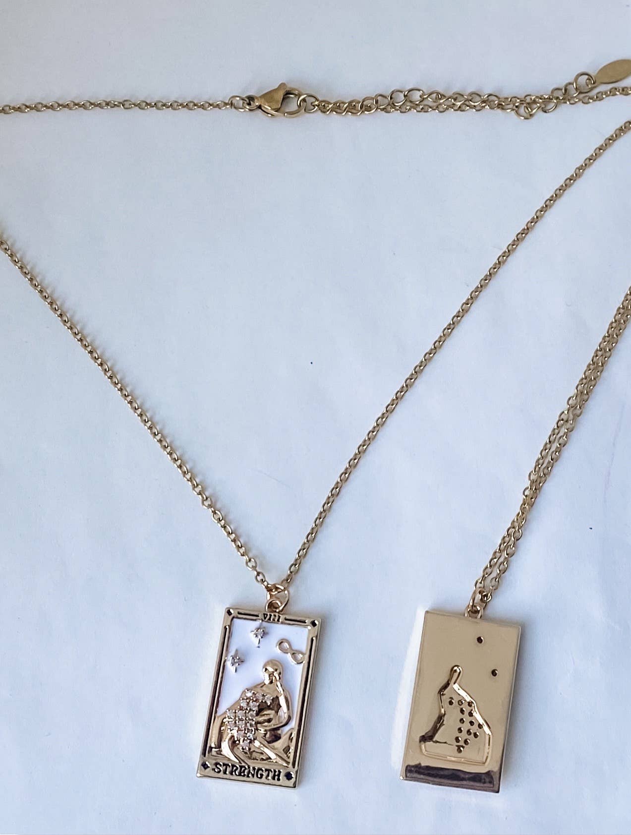 18 K Gold plated steel. This is hand engraved and drilled so the light moves through the pendant and the crystals Each crystal is hand set. Enamel in The French style is flooded over with gold for high shine. Steel will not tarnish Hypoallergenic Waterproof Lobster claw Clasp 16-18 " chain 1.5" pendant. 3 inch extender Guaranteed Quality The Strength Card is a talisman that you can handle this. That not his is more than you can handle.